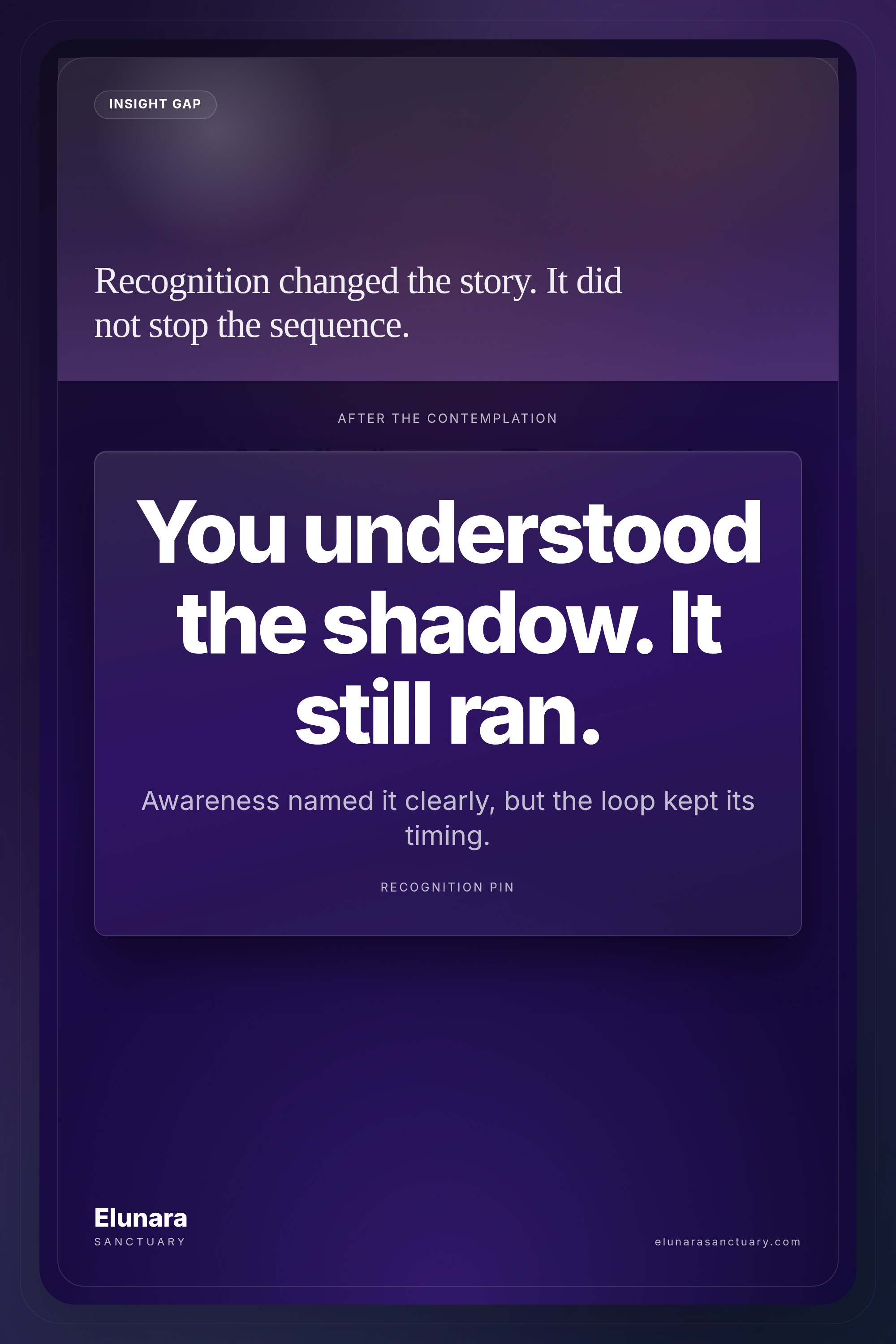 The shadow runs at a behavioral level โ a specific thought, at a specific moment, in a specific sequence, in a specific domain. Knowing that your shadow is "Victimisation" deeply and compassionately is different from knowing that your version of step four sounds like "this proves I am not supported" and knowing the specific protocol for the next thirty seconds after that thought arrives.