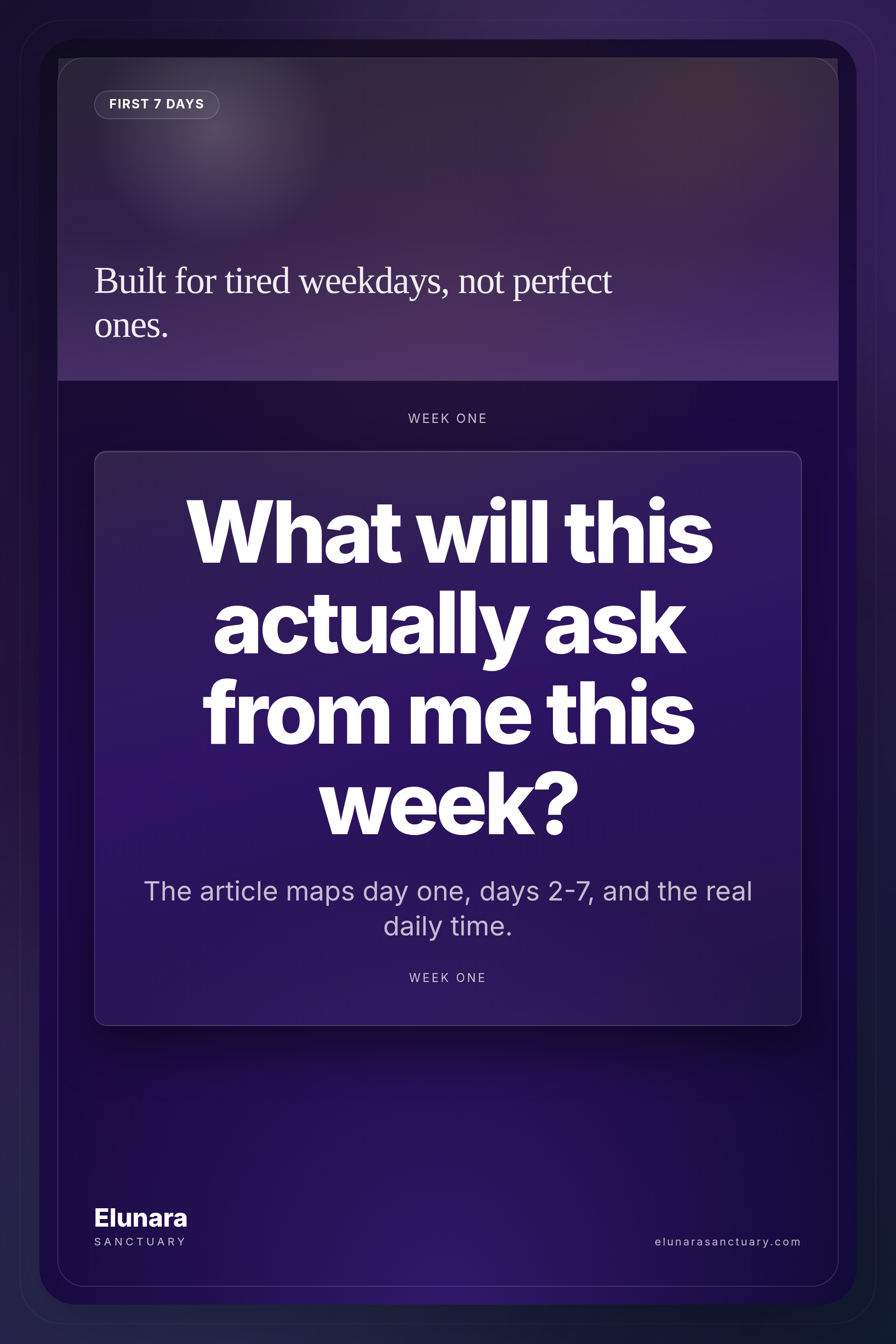 You are not wondering whether to "do self-work." You are wondering what this will actually demand on a real weekday when you are tired and already overloaded. The 90-day protocol starts on the day after your Blueprint is delivered. Here is exactly what the first seven days look like — the time commitment, the content, the rhythm, and the honest difficulty level.