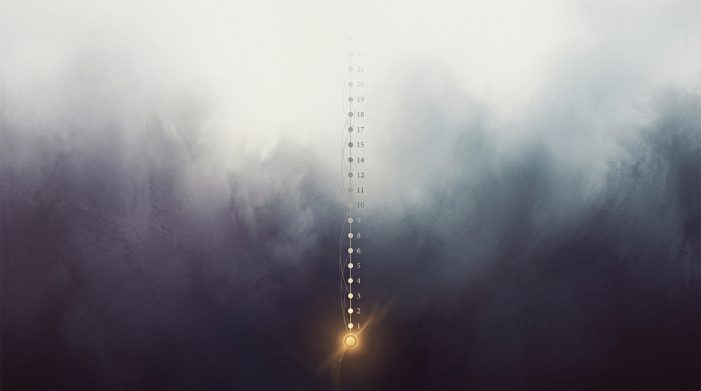Abstract diagram of a vertical path through soft nodes, one node glowing gold at the base — challenge line metaphor.